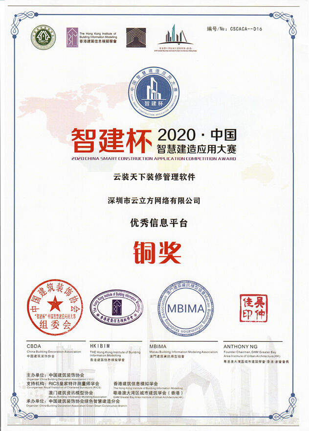 云立方在2020“智建杯”中國(guó)智慧建造論壇中脫穎而出,榮獲優(yōu)秀信息平臺(tái)銅獎(jiǎng)。此次大賽由中國(guó)建筑裝飾協(xié)會(huì)主辦、中國(guó)建筑裝飾協(xié)會(huì)綠色智慧建造分會(huì)和深圳市裝飾行業(yè)協(xié)會(huì)協(xié)辦。